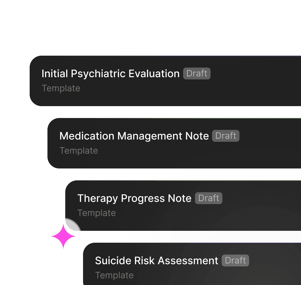 Access pre-built templates for evaluations, therapy sessions, and medication checks. Spend less time charting and more time with patients, without compromising documentation quality.